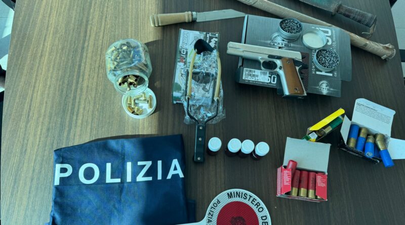 Durante la perquisizione, eseguita presso l’abitazione dell’uomo, gli agenti hanno rinvenuto e sequestrato diverse cartucce di vario calibro, una pistola ad aria compressa priva del prescritto tappo rosso, un bastone in legno, un coltello di grosse dimensioni e un contenitore in vetro con numerosi bossoli esplosi.