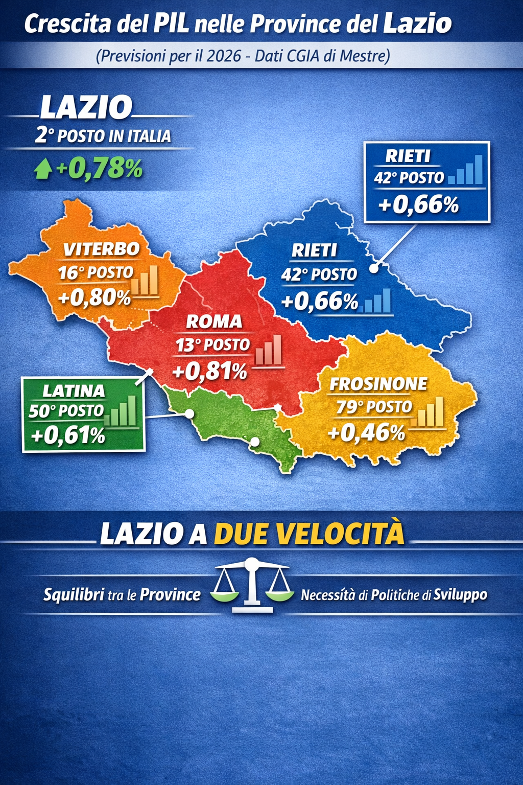 Secondo le previsioni dell’Ufficio studi della CGIA di Mestre, la provincia di Latina si colloca nella fascia centrale della classifica nazionale sulla crescita del PIL provinciale prevista per il 2026. Nell’analisi che prende in esame 107 territori, Latina occupa il 50° posto, con una variazione del prodotto interno lordo pari a +0,61 per cento rispetto al 2025. Un dato in linea con la media di molte province del Centro Italia, ma distante dalle performance delle aree più dinamiche del Nord.